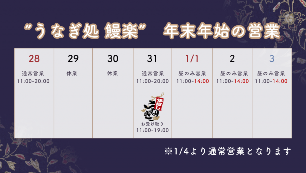 「うなぎ処 鰻楽」 ”年越しうなぎ”のお知らせ